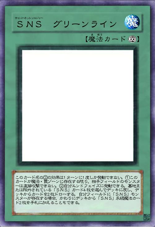 | このカード名の②の効果は1ターンに1度しか発動できない。①このカードが魔法・罠ゾーンに存在する限り、相手フィールドのモンスターは直接攻撃できない。②自分エンドフェイズに発動できる。墓地または除外されている「SNS」カード4枚を選んでデッキに戻し、デッキからカードを2枚ドローする。自分フィールドに「SNS」モンスターが存在する場合、かわりにデッキから「SNS」永続魔法カード2枚を手札に加えることもできる。 | |||