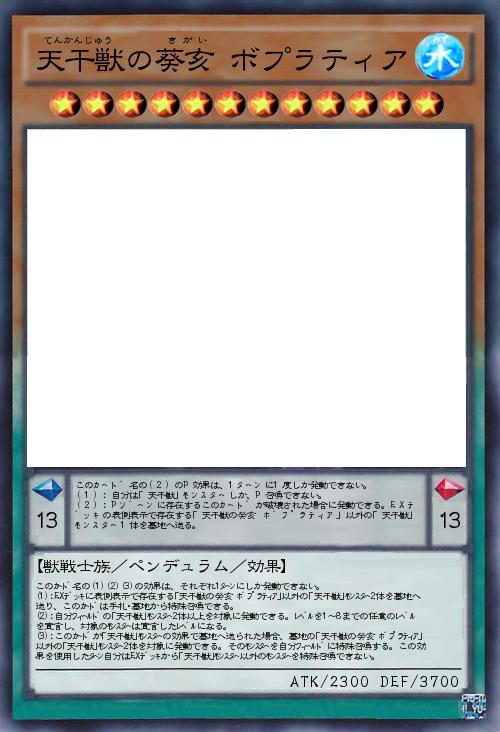 | このカード名の(1)(2)(3)の効果は、それぞれ1ターンにしか発動できない。 (1):EXデッキに表側表示で存在する「天干獣の癸亥 ボプラティア」以外の「天干獣」モンスター2体を墓地へ送り、このカードは手札・墓地から特殊召喚できる。 (2):自分フィールドの「天干獣」モンスター2体以上を対象に発動できる。レベルを1~8までの任意のレベルを宣言し、対象のモンスターは宣言したレベルになる。 (3):このカードが「天干獣」モンスターの効果で墓地へ送られた場合、墓地の「天干獣の癸亥 ボプラティア」以外の「天干獣」モンスター2体を対象に発動できる。そのモンスターを自分フィールドに特殊召喚する。この効果を使用したターン自分はEXデッキから「天干獣」モンスター以外のモンスターを特殊召喚できない。 | |||