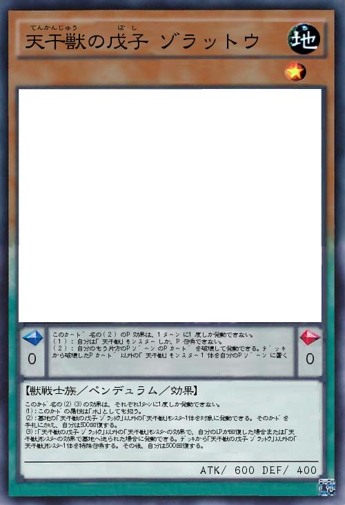 | このカード名の(2)(3)の効果は、それぞれ1ターンに1度しか発動できない。 (1):このカードの属性は「水」としても扱う。 (2):墓地の「天干獣の戊子 ゾラットウ」以外の「天干獣」モンスター1体を対象に発動できる。そのカードを手札に加え、自分は500回復する。 (3):「天干獣の戊子 ゾラットウ」以外の「天干獣」モンスターの効果で、自分のLPが回復した場合または「天干獣」モンスターの効果で墓地へ送られた場合に発動できる。デッキから「天干獣の戊子 ゾラットウ」以外の「天干獣」モンスター1体を特殊召喚する。その後、自分は500回復する。 | |||