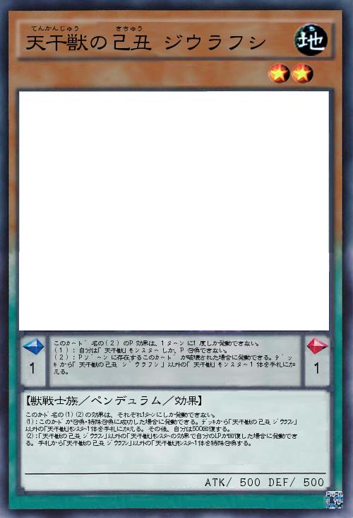 | このカード名の(1)(2)の効果は、それぞれ1ターンにしか発動できない。 (1):このカードが召喚・特殊召喚に成功した場合に発動できる。デッキから「天干獣の己丑 ジウラフシ」以外の「天干獣」モンスター1体を手札に加える。その後、自分は500回復する。 (2):「天干獣の己丑 ジウラフシ」以外の「天干獣」モンスターの効果で自分のLPが回復した場合に発動できる。手札から「天干獣の己丑 ジウラフシ」以外の「天干獣」モンスター1体を特殊召喚する。 | |||