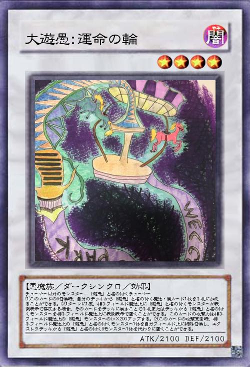 | チューナー以外のモンスター-「遊愚」と名の付くチューナー ①このカードのS召喚時、自分のデッキから「遊愚」と名の付く魔法・罠カード1枚を手札に加えることができる。②1ターンに1度、相手フィールド魔法上に「遊愚」と名の付くモンスターが表側表示で存在する場合、そのカードをデッキに戻すことで手札またはデッキから「遊愚」と名の付くモンスターを相手フィールド魔法上に表側表示で置くことができる。このカードの攻撃力は相手フィールド魔法上の「遊愚」モンスターのLv×200アップする。③このカードの攻撃宣言時、相手フィールド魔法上の「遊愚」と名の付くモンスター1体を自分フィールド上に特殊召喚し、エクストラデッキから「遊愚」と名の付くSモンスター1体を代わりに置くことができる。 | |||