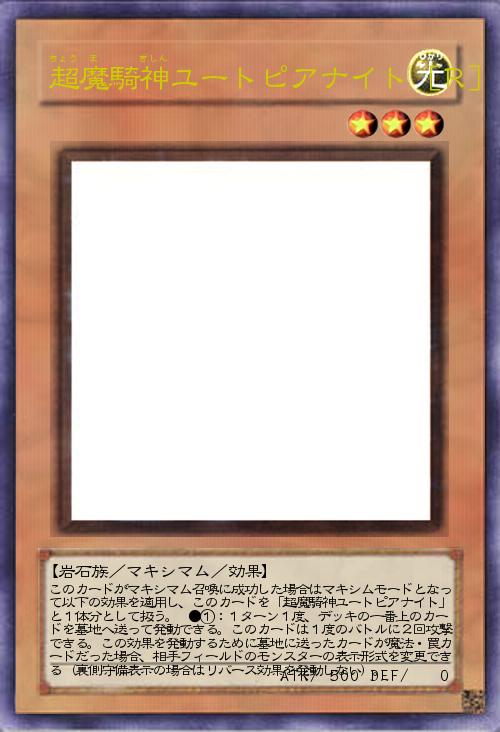 | このカードがマキシマム召喚に成功した場合はマキシムモードとなって以下の効果を適用し、このカードを「超魔騎神ユートピアナイト」と1体分として扱う。 ●①:1ターン1度、デッキの一番上のカードを墓地へ送って発動できる。このカードは1度のバトルに2回攻撃できる。この効果を発動するために墓地に送ったカードが魔法・罠カードだった場合、相手フィールドのモンスターの表示形式を変更できる(裏側守備表示の場合はリバース効果を発動しない)。 | |||