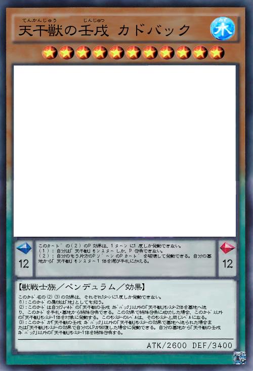 | このカード名の(2)(3)の効果は、それぞれ1ターンに1度しか発動できない。 (1):このカードの属性は「地」としても扱う。 (2):このカードは自分フィールドの「天干獣の壬戌 カドバック」以外の「天干獣」モンスター2体を墓地へ送り、このカードを手札・墓地から特殊召喚できる。この効果で特殊召喚に成功した場合、このカード以外の「天干獣」モンスター1体を対象に発動する。このモンスターのレベルは、そのモンスターと同じレベルになる。 (3):このカードが「天干獣の壬戌 カドバック」以外の「天干獣」モンスターの効果で墓地へ送られた場合または「天干獣」モンスターの効果で自分のLPが回復した場合に発動できる。自分の墓地から「天干獣の壬戌 カドバック」以外の「天干獣」モンスター1体を特殊召喚する。 | |||