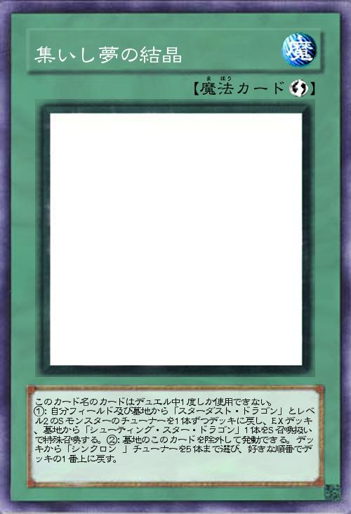 | このカード名のカードはデュエル中1度しか使用できない。 ①:自分フィールド及び墓地から「スターダスト・ドラゴン」とレベル2のSモンスターのチューナーを1体ずつデッキに戻し、EXデッキ、墓地から「シューティング・スター・ドラゴン」1体をS召喚扱いで特殊召喚する。②:墓地のこのカードを除外して発動できる。デッキから「シンクロン 」チューナーを5体まで選び、好きな順番でデッキの1番上に戻す。 | |||
