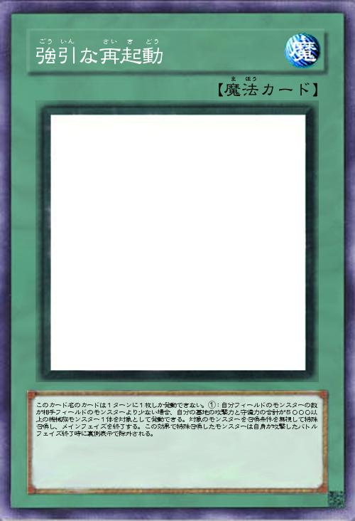 | このカード名のカードは1ターンに1枚しか発動できない。①:自分フィールドのモンスターの数が相手フィールドのモンスターより少ない場合、自分の墓地の攻撃力と守備力の合計が5000以上の機械族モンスター1体を対象として発動できる。対象のモンスターを召喚条件を無視して特殊召喚し、メインフェイズを終了する。この効果で特殊召喚したモンスターは自身が攻撃したバトルフェイズ終了時に裏側表示で除外される。 | |||