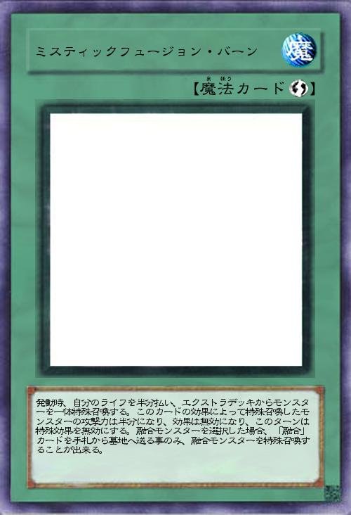| 発動時、自分のライフを半分払い、エクストラデッキからモンスターを一体特殊召喚する。このカードの効果によって特殊召喚したモンスターの攻撃力は半分になり、効果は無効になり、このターンは特殊効果を無効にする。融合モンスターを選択した場合、「融合」カードを手札から墓地へ送る事のみ、融合モンスターを特殊召喚することが出来る。 | |||