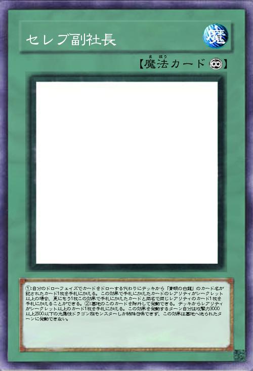 | ①:自分のドローフェイズでカードをドローする代わりにデッキから「青眼の白龍」のカード名が記されたカード1枚を手札に加える。この効果で手札に加えたカードのレアリティがシークレット以上の場合、更にもう1枚この効果で手札に加えたカードと同名で同じレアリティのカード1枚を手札に加えることができる。②:墓地のこのカードを除外して発動できる。デッキからレアリティがシークレット以上のカード1枚を手札に加える。この効果を発動するターン自分は攻撃力3000以上2500以下の光属性ドラゴン族モンスターしか特殊召喚できず、この効果は墓地へ送られたターンに発動できない。 | |||