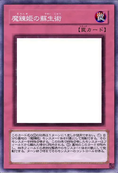 | このカード名の②の効果は1ターンに1度しか使用できない。①:自分の墓地の「魔錬姫」モンスター1体を対象にして発動できる。そのモンスターを特殊召喚する。この効果で特殊召喚したモンスターはフィールドから離れた場合に除外される。②:墓地のこのカードを除外し、相手フィールドの表側攻撃表示のモンスター1体を対象にして発動できる。ターン終了時までそのモンスターのコントロールを得る。 | |||