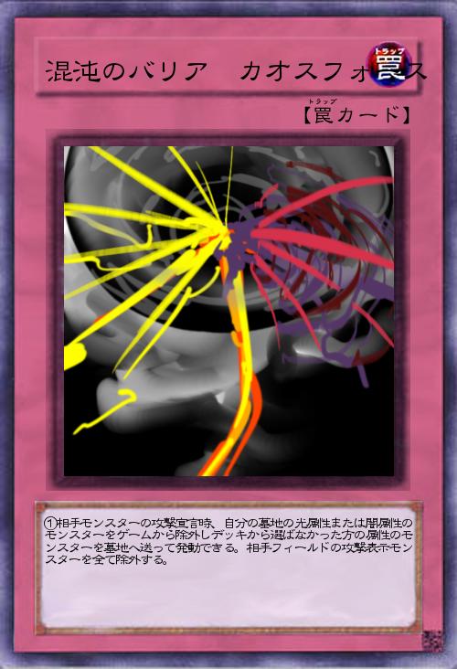 | ①相手モンスターの攻撃宣言時、自分の墓地の光属性または闇属性のモンスターをゲームから除外しデッキから選ばなかった方の属性のモンスターを墓地へ送って発動できる。相手フィールドの攻撃表示モンスターを全て除外する。 | |||