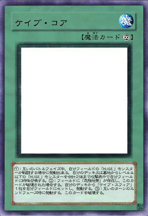 | ①:互いのバトルフェイズ中、自分フィールドの「HUGE」モンスターが戦闘する場合に発動出来る。自分のデッキ又は墓地からレベル4以下の「HUGE」モンスターを合計2体まで攻撃表示で自分フィールドに特殊召喚する。②:フィールドに「危険地帯」が存在し、このカードが破壊された場合する。自分のデッキから「ケイブ・スフィア」1枚を自分フィールドにセットし、発動する。③:互いのターンのエンドフェーズ時に発動する。このカードを破壊する。 | |||
