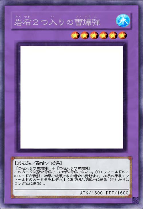 | 「岩石入りの雪爆弾」+「岩石入りの雪爆弾」 このカードは融合召喚でしか特殊召喚できない。①:フィールドのこのカードが戦闘・効果で破壊された場合に発動する。相手の手札・フィールドのカードをそれぞれ1枚まで選んで墓地に送る(手札からはランダムに選ぶ)。 | |||