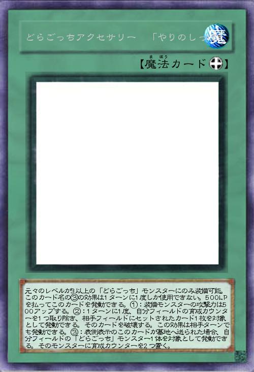 | 元々のレベルが3以上の「どらごっち」モンスターにのみ装備可能。このカード名の③の効果は1ターンに1度しか使用できない。500LPを払ってこのカードを発動できる。①:装備モンスターの攻撃力は500アップする。②:1ターンに1度、自分フィールドの育成カウンターを1つ取り除き、相手フィールドにセットされたカード1枚を対象として発動できる。そのカードを破壊する。この効果は相手ターンでも発動できる。③:表側表示のこのカードが墓地へ送られた場合、自分フィールドの「どらごっち」モンスター1体を対象として発動できる。そのモンスターに育成カウンターを2つ置く。 | |||