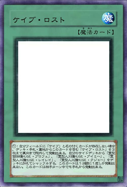 | ①:自分フィールドに「ケイブ」と名の付くカードが存在しない場合、デッキ・手札・墓地からこのカードを含む「ケイブ・ロスト」を3枚まで裏向きで除外して発動出来る。自分のサイドデッキから「霊型個体種HUGE・プロフェ」、「霊型人工種HUGE・アイミー」、「霊型人工種HUGE・レイレイ」、「霊型人工種HUGE・クジョー」をデッキに加えてシャッフルする。このカードは1決闘に1度しか発動出来ない。このカードは相手ターン中でも手札から発動出来る。 | |||