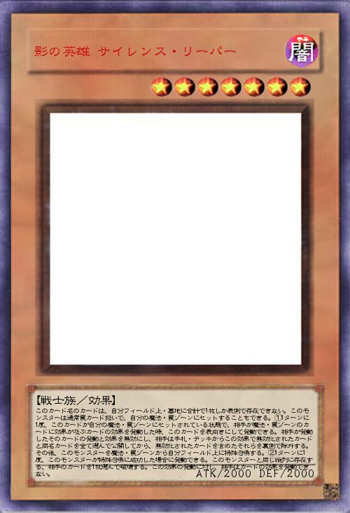 | このカード名のカードは、自分フィールド上・墓地に合計で1枚しか表側で存在できない。このモンスターは通常罠カード扱いで、自分の魔法・罠ゾーンにセットすることもできる。①1ターンに1度、このカードが自分の魔法・罠ゾーンにセットされている状態で、相手が魔法・罠ゾーンのカードに効果が及ぶカードの効果を発動した時、このカードを表向きにして発動できる。相手が発動したそのカードの発動と効果を無効にし、相手は手札・デッキからこの効果で無効化されたカードと同名カードを全て選んで公開してから、無効化されたカードを含めたそれらを裏側で除外する。その後、このモンスターを魔法・罠ゾーンから自分フィールド上に特殊召喚する。②1ターンに1度、このモンスターが特殊召喚に成功した場合に発動できる。このモンスターと同じ縦列に存在する、相手のカードを1枚選んで破壊する。この効果の発動に対し、相手はカードの効果を発動できない。 | |||