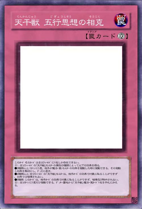 | このカード名のカードは自分フィールドに1枚しか存在できない。 (1):自分フィールドの「天干獣」モンスターの属性の種類によって以下の効果を得る。 ●3種類以上:1ターンに1度、相手が魔法・罠・モンスターの効果を発動した時に発動できる。その発動と効果を無効にし、デッキに戻す。 ●4種類以上:自分フィールドの「天干獣」モンスターは、相手カードの効果で対象に取ることができず、効果では破壊されない。 ●5種類:このカードは、相手カードの効果で対象に取ることができず、破壊及び除外されない。 (2):自分ターンに1度だけ発動できる。デッキ・墓地から「天干獣」魔法・罠カード1枚を手札に加える。 | |||