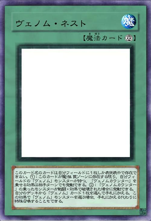 | このカード名のカードは自分フィールドに1枚しか表側表示で存在できない。①:このカードが魔法&罠ゾーンに存在する限り、自分フィールドの「ヴェノム」モンスターが持つ、「ヴェノムカウンター」を乗せる効果は相手ターンでも発動できる。②:「ヴェノムカウンター」の乗ったモンスターが戦闘・効果で破壊された場合に発動できる。自分のデッキから「ヴェノム」カード1枚を選んで手札に加える。この効果で「ヴェノム」モンスターを選ぶ場合、手札に加える代わりに特殊召喚することもできる。 | |||