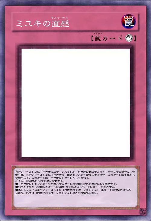 ミユキの名を冠し、ミユキが場に居ることをトリガーとするカウンター罠。儀式の「白き地の」モンスターが居れば手札から飛んでくる。