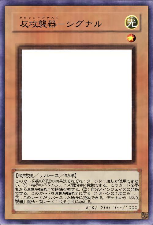 | このカード名の①③の効果はそれぞれ1ターンに1度しか使用できない。①:相手のバトルフェイズ開始時に発動できる。このカードを手札から裏側守備表示で特殊召喚する。②:自分メインフェイズに発動できる。このカードを裏側守備表示にする(1ターンに1度のみ)。③:このカードがリバースした場合に発動できる。デッキから「反攻襲器」魔法・罠カード1枚を手札に加える。 | |||