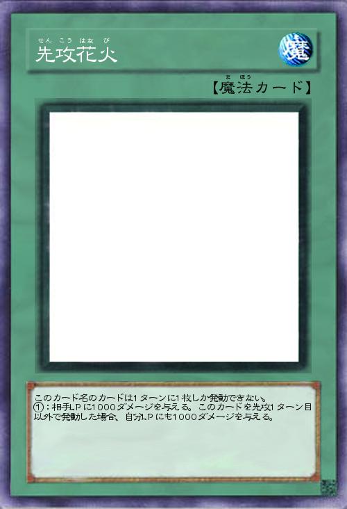 | このカード名のカードは1ターンに1枚しか発動できない。 ①:相手LPに1000ダメージを与える。このカードを先攻1ターン目以外で発動した場合、自分LPにも1000ダメージを与える。 | |||
