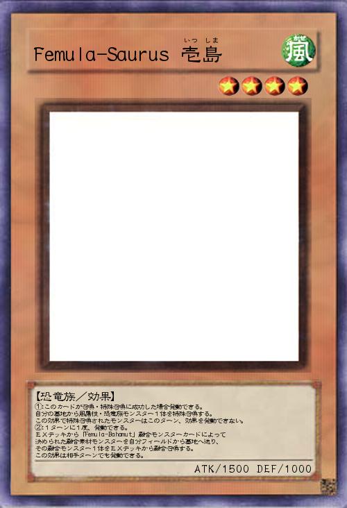 | ①:このカードが召喚・特殊召喚に成功した場合発動できる。 自分の墓地から風属性・恐竜族モンスター1体を特殊召喚する。 この効果で特殊召喚されたモンスターはこのターン、効果を発動できない。 ②:1ターンに1度、発動できる。 EXデッキから「Femula-Bahamut」融合モンスターカードによって 決められた融合素材モンスターを自分フィールドから墓地へ送り、 その融合モンスター1体をEXデッキから融合召喚する。 この効果は相手ターンでも発動できる。 | |||