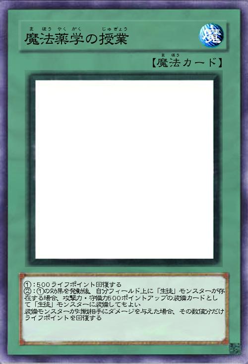 | ①:500ライフポイント回復する ②:①の効果を発動後、自分フィールド上に「生徒」モンスターが存在する場合、攻撃力・守備力500ポイントアップの装備カードとして「生徒」モンスターに装備してもよい 装備モンスターが対戦相手にダメージを与えた場合、その数値分だけライフポイントを回復する | |||