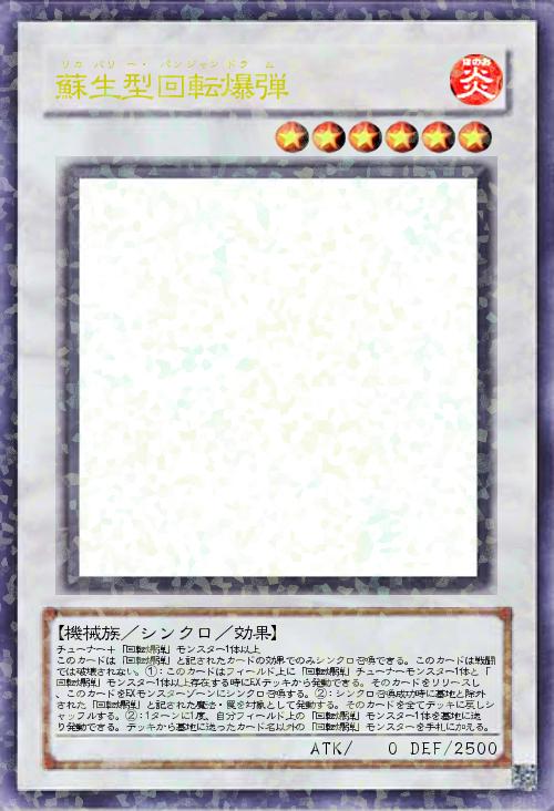 | チューナー+「回転爆弾」モンスター1体以上 このカードは「回転爆弾」と記されたカードの効果でのみシンクロ召喚できる。このカードは戦闘では破壊されない。①:このカードはフィールド上に「回転爆弾」チューナーモンスター1体と「回転爆弾」モンスター1体以上存在する時にEXデッキから発動できる。そのカードをリリースし、このカードをEXモンスターゾーンにシンクロ召喚する。②:シンクロ召喚成功時に墓地と除外された「回転爆弾」と記された魔法・罠を対象として発動する。そのカードを全てデッキに戻しシャッフルする。②:1ターンに1度、自分フィールド上の「回転爆弾」モンスター1体を墓地に送り発動できる。デッキから墓地に送ったカード名以外の「回転爆弾」モンスターを手札に加える。 | |||
