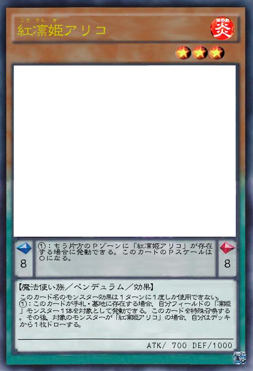 | ①:もう片方のPゾーンに「紅凛姫アリコ」が存在する場合に発動できる。このカードのPスケールは0になる。 | |||