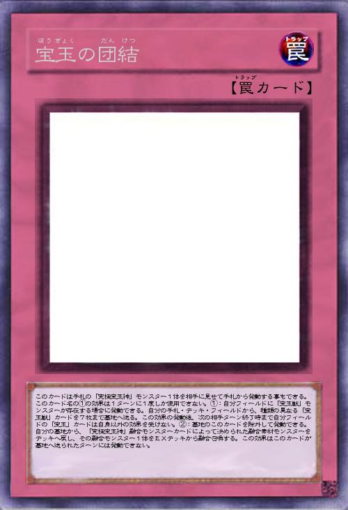 | このカードは手札の「究極宝玉神」モンスター1体を相手に見せて手札から発動する事もできる。このカード名の①の効果は1ターンに1度しか使用できない。①:自分フィールドに「宝玉獣」モンスターが存在する場合に発動できる。自分の手札・デッキ・フィールドから、種類の異なる「宝玉獣」カードを7枚まで墓地へ送る。この効果の発動後、次の相手ターン終了時まで自分フィールドの「宝玉」カードは自身以外の効果を受けない。②:墓地のこのカードを除外して発動できる。自分の墓地から、「究極宝玉神」融合モンスターカードによって決められた融合素材モンスターをデッキへ戻し、その融合モンスター1体をEXデッキから融合召喚する。この効果はこのカードが墓地へ送られたターンには発動できない。 | |||
