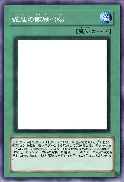 | このカード名のカードは1ターンに1枚しか使用できない。①:自分の墓地の「蛇辿」モンスター2体を除外して発動できる。デッキからレベル7以上の爬虫類族モンスター1体を特殊召喚する。この効果で「蛇辿」モンスターを特殊召喚した場合、デッキから「蛇辿の錬魔召喚」以外の「蛇辿」通常魔法カード1枚を手札に加えることができる。 | |||