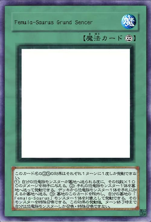 | このカード名の②③の効果はそれぞれ1ターンに1度しか発動できない。 ①:自分の恐竜族モンスターが墓地へ送られる度に、その枚数×100のダメージを相手に与える。②:手札の恐竜族モンスター1体を墓地へ送って発動できる。デッキから恐竜族モンスター1体を手札に加えるか墓地へ送る。③:墓地のこのカードを除外し、自分の墓地の「Femula-Saurus」モンスター1体を対象として発動できる。そのモンスターを特殊召喚できる。この効果の発動後、ターン終了時まで自分は恐竜族モンスターしか召喚・特殊召喚できない。 | |||
