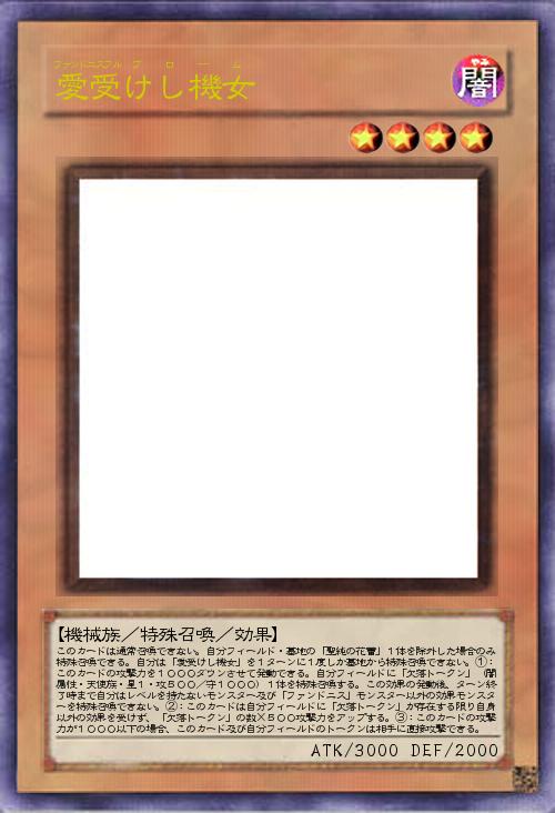 | このカードは通常召喚できない。自分フィールド・墓地の「聖純の花蕾」1体を除外した場合のみ特殊召喚できる。自分は「愛受けし機女」を1ターンに1度しか墓地から特殊召喚できない。①:このカードの攻撃力を1000ダウンさせて発動できる。自分フィールドに「欠落トークン」(闇属性・天使族・星1・攻500/守1000)1体を特殊召喚する。この効果の発動後、ターン終了時まで自分はレベルを持たないモンスター及び「ファンドニス」モンスター以外の効果モンスターを特殊召喚できない。②:このカードは自分フィールドに「欠落トークン」が存在する限り自身以外の効果を受けず、「欠落トークン」の数×500攻撃力をアップする。③:このカードの攻撃力が1000以下の場合、このカード及び自分フィールドのトークンは相手に直接攻撃できる。 | |||