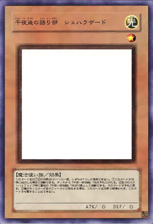 | このカード名の①②の効果は1ターンに一度、いずれか1つしか使用できない。①このカードが召喚に成功した場合に発動できる。デッキから「千夜一夜物語」1枚を手札に加える。②自分のスタンバイフェイズ時に墓地の「千夜一夜物語」1枚を対象として発動できる。そのカードを手札に戻す。③儀式モンスターが自分フィールドに存在する場合、このカードは効果で破壊されず、このカードを攻撃することはできない。 | |||