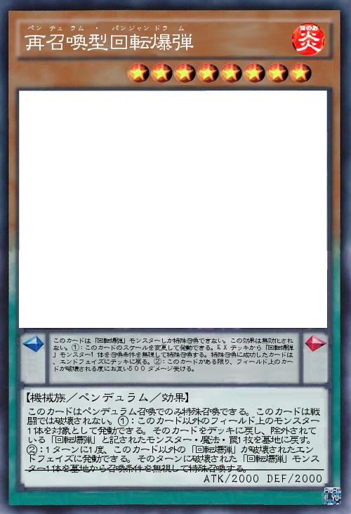 | このカードは「回転爆弾」モンスターしか特殊召喚できない。この効果は無効化されない。①:このカードのスケールを変更して発動できる。EXデッキから「回転爆弾」モンスター1体を召喚条件を無視して特殊召喚する。特殊召喚に成功したカードは、エンドフェイズにデッキに戻る。②:このカードがある限り、フィールド上のカードが破壊される度にお互い500ダメージ受ける。 | |||