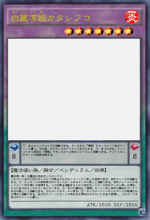 | ①:自分メインフェイズに発動できる。デッキから「凛姫」Pモンスター1体をPゾーンに置く。その後、そのカードのPスケールを0にする。②:自分の手札・フィールドから同名の「凛姫」Pモンスター2体をリリースして発動できる。Pゾーンのこのカードを特殊召喚する。 | |||