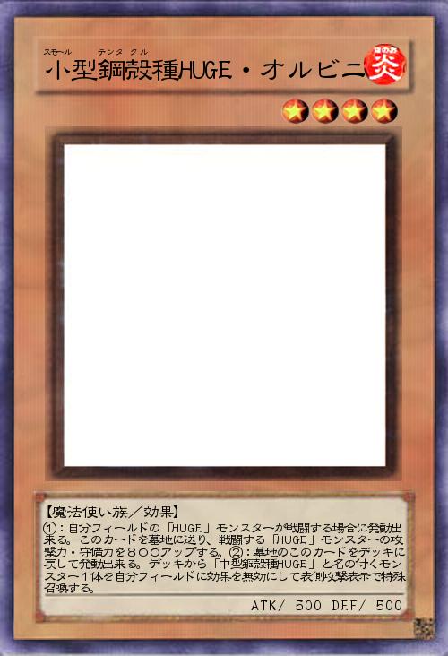 | ①:自分フィールドの「HUGE」モンスターが戦闘する場合に発動出来る。このカードを墓地に送り、戦闘する「HUGE」モンスターの攻撃力・守備力を800アップする。②:墓地のこのカードをデッキに戻して発動出来る。デッキから「中型鋼殻種HUGE」と名の付くモンスター1体を自分フィールドに効果を無効にして表側攻撃表示で特殊召喚する。 | |||