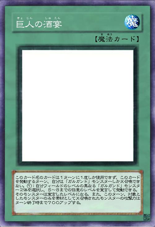 | このカード名のカードは1ターンに1度しか使用できず、このカードを発動するターン、自分は「ガルガンド」モンスターしかX召喚できない。①:自分フィールドのレベルの異なる「ガルガンド」モンスター2体を選択し、5~8までの任意のレベルを宣言して発動できる。そのモンスターは宣言したレベルになる。また、このターン、対象としたモンスターのみを素材としてX召喚されたモンスターの攻撃力はターン終了時まで700アップする。 | |||