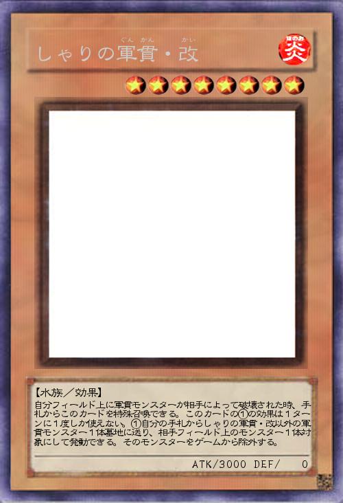 | 自分フィールド上に軍貫モンスターが相手によって破壊された時、手札からこのカードを特殊召喚できる。このカードの①の効果は1ターンに1度しか使えない。①自分の手札からしゃりの軍貫・改以外の軍貫モンスター1体墓地に送り、相手フィールド上のモンスター1体対象にして発動できる。そのモンスターをゲームから除外する。 | |||