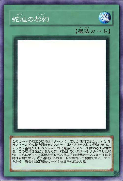| このカード名の②の効果は1ターンに1度しか使用できない。①:自分フィールドの爬虫類族モンスター1体をリリースして発動できる。デッキ・墓地からレベル4以下の恐竜族モンスター1体を特殊召喚する。この効果を発動するために「蛇辿」モンスターをリリースした場合、さらにデッキ・墓地からレベル8以下の恐竜族モンスター1体を特殊召喚できる。②:墓地のこのカードを除外して発動できる。デッキから「融合」通常魔法カード1枚を手札に加える。 | |||