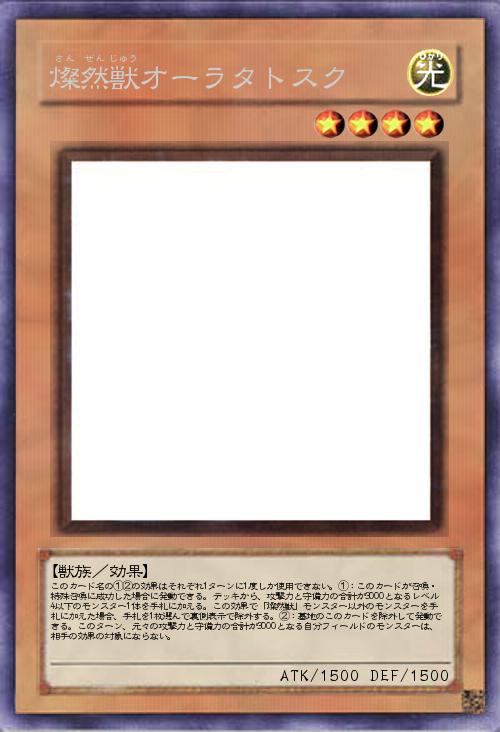 | このカード名の①②の効果はそれぞれ1ターンに1度しか使用できない。①:このカードが召喚・特殊召喚に成功した場合に発動できる。デッキから、攻撃力と守備力の合計が3000となるレベル4以下のモンスター1体を手札に加える。この効果で「燦然獣」モンスター以外のモンスターを手札に加えた場合、手札を1枚選んで裏側表示で除外する。②:墓地のこのカードを除外して発動できる。このターン、元々の攻撃力と守備力の合計が3000となる自分フィールドのモンスターは、相手の効果の対象にならない。 | |||