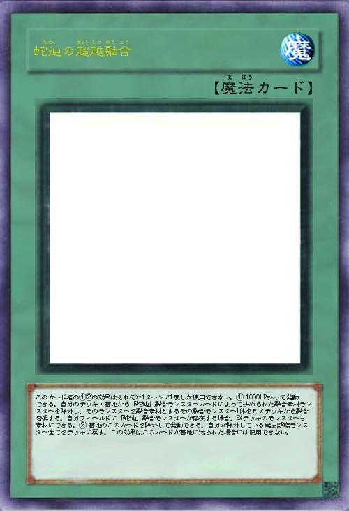 | このカード名の①②の効果はそれぞれ1ターンに1度しか使用できない。①:1000LP払って発動できる。自分のデッキ・墓地から「蛇辿」融合モンスターカードによって決められた融合素材モンスターを除外し、そのモンスターを融合素材とするその融合モンスター1体をEXデッキから融合召喚する。自分フィールドに「蛇辿」融合モンスターが存在する場合、EXデッキのモンスターも素材にできる。②:墓地のこのカードを除外して発動できる。自分が除外している爬虫類族モンスター全てをデッキに戻す。この効果はこのカードが墓地に送られた場合には使用できない。 | |||