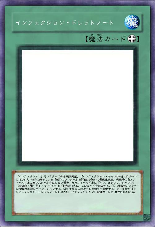 | 「インフェクション」モンスターにのみ装備可能。『インフェクション・キャンサー』は1ターンに1枚だけ、相手に乗っている「感染カウンター」を5個取り除いて発動出来る。発動時に自分フィールド上にモンスターが存在しない場合、自分フィールド上に「インフェクショントークン」 (機械族・闇・星1・攻/守0)を1体特殊召喚し、このカードを装備する。①:装備モンスターの攻撃力は2800ポイントアップする。②:手札のこのカードを捨てて発動する。デッキから「インフェクション・ドレットノート」以外の「インフェクション」装備カードを1枚手札に加える。 | |||