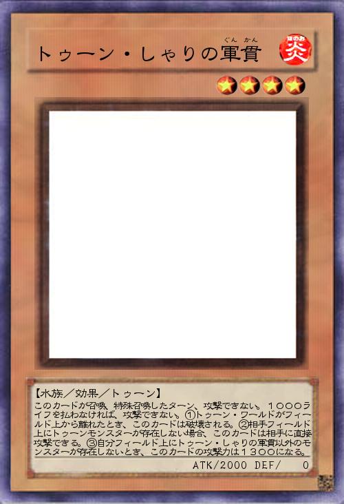| このカードが召喚、特殊召喚したターン、攻撃できない。1000ライフを払わなければ、攻撃できない。①トゥーン・ワールドがフィールド上から離れたとき、このカードは破壊される。②相手フィールド上にトゥーンモンスターが存在しない場合、このカードは相手に直接攻撃できる。③自分フィールド上にトゥーン・しゃりの軍貫以外のモンスターが存在しないとき、このカードの攻撃力は1300になる。 | |||