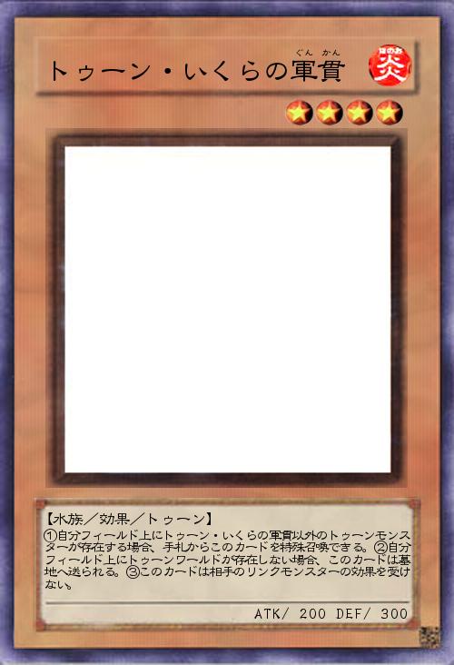 | ①自分フィールド上にトゥーン・いくらの軍貫以外のトゥーンモンスターが存在する場合、手札からこのカードを特殊召喚できる。②自分フィールド上にトゥーンワールドが存在しない場合、このカードは墓地へ送られる。③このカードは相手のリンクモンスターの効果を受けない。 | |||