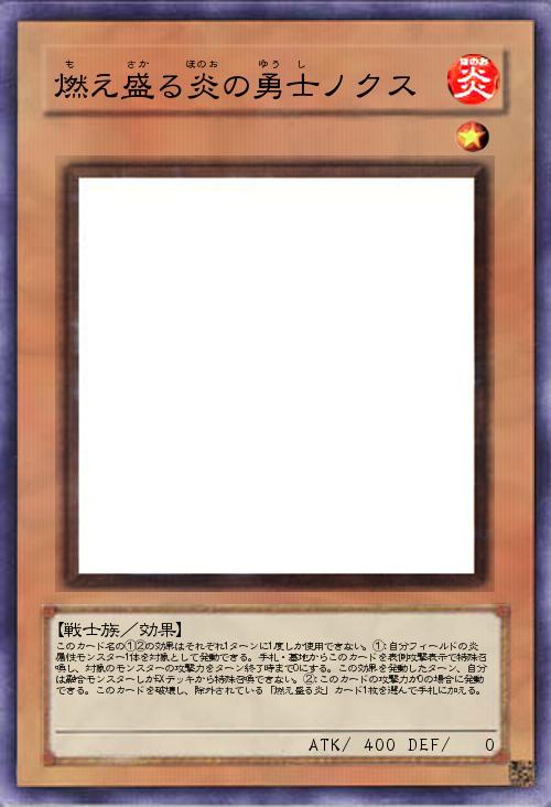 | このカード名の①②の効果はそれぞれ1ターンに1度しか使用できない。①:自分フィールドの炎属性モンスター1体を対象として発動できる。手札・墓地からこのカードを表側攻撃表示で特殊召喚し、対象のモンスターの攻撃力をターン終了時まで0にする。この効果を発動したターン、自分は融合モンスターしかEXデッキから特殊召喚できない。②:このカードの攻撃力が0の場合に発動できる。このカードを破壊し、除外されている「燃え盛る炎」カード1枚を選んで手札に加える。 | |||