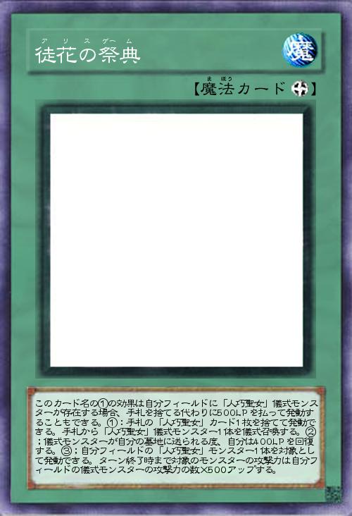 | このカード名の①の効果は自分フィールドに「人巧聖女」儀式モンスターが存在する場合、手札を捨てる代わりに500LPを払って発動することもできる。①:手札の「人巧聖女」カード1枚を捨てて発動できる。手札から「人巧聖女」儀式モンスター1体を儀式召喚する。②;儀式モンスターが自分の墓地に送られる度、自分は400LPを回復する。③;自分フィールドの「人巧聖女」モンスター1体を対象として発動できる。ターン終了時まで対象のモンスターの攻撃力は自分フィールドの儀式モンスターの攻撃力の数×500アップする。 | |||
