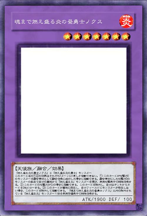| 「燃え盛る炎の勇士ノクス」+「燃え盛る炎の勇士」モンスター このカード名の①②の効果はそれぞれ1ターンに1度しか発動できない。①:このカードが攻撃力0のモンスターを融合素材として融合召喚に成功した場合に発動できる。融合素材にした攻撃力0のモンスターの数まで自分の墓地から「燃え盛る炎」モンスターを選び、表側攻撃表示で特殊召喚する。②:このカードの攻撃力が0の場合に発動できる。このカードを除外し、自分はデッキからカードを2枚ドローする。③:このカードが墓地に存在し、自分フィールドにモンスターが存在しない場合、このカードを除外して発動できる。「魂まで燃え盛る炎の昼勇士ノクス」以外の除外されている「燃え盛る炎」モンスター1体を表側守備表示で特殊召喚する。 | |||