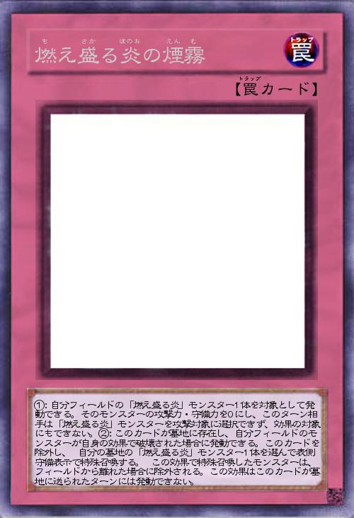 | ①:自分フィールドの「燃え盛る炎」モンスター1体を対象として発動できる。そのモンスターの攻撃力・守備力を0にし、このターン相手は「燃え盛る炎」モンスターを攻撃対象に選択できず、効果の対象にもできない。②:このカードが墓地に存在し、自分フィールドのモンスターが自身の効果で破壊された場合に発動できる。このカードを除外し、 自分の墓地の「燃え盛る炎」モンスター1体を選んで表側守備表示で特殊召喚する。 この効果で特殊召喚したモンスターは、フィールドから離れた場合に除外される。この効果はこのカードが墓地に送られたターンには発動できない。 | |||