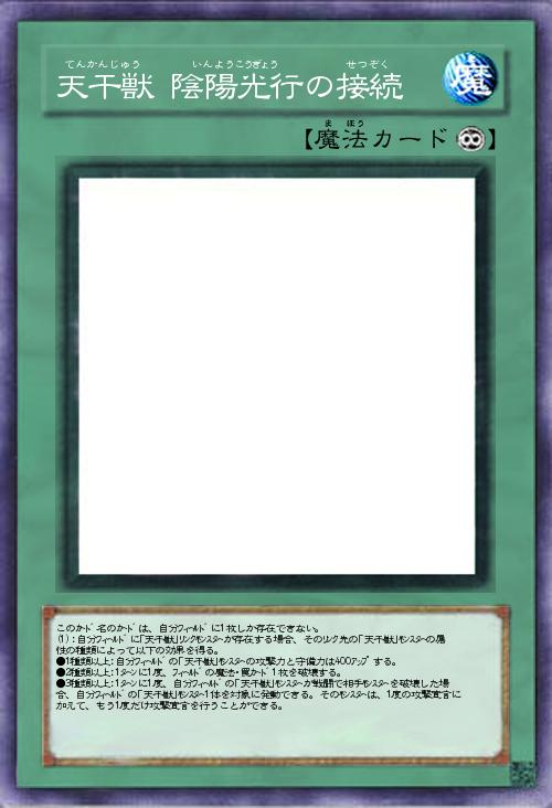| このカード名のカードは、自分フィールドに1枚しか存在できない。 (1):自分フィールドに「天干獣」リンクモンスターが存在する場合、そのリンク先の「天干獣」モンスターの属性の種類によって以下の効果を得る。 ●1種類以上:自分フィールドの「天干獣」モンスターの攻撃力と守備力は400アップする。 ●2種類以上:1ターンに1度、フィールドの魔法・罠カード1枚を破壊する。 ●3種類以上:1ターンに1度、自分フィールドの「天干獣」モンスターが戦闘で相手モンスターを破壊した場合、自分フィールドの「天干獣」モンスター1体を対象に発動できる。そのモンスターは、1度の攻撃宣言に加えて、もう1度だけ攻撃宣言を行うことができる。 | |||