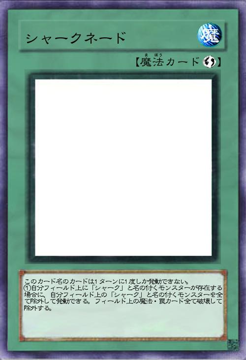 | このカード名のカードは1ターンに1度しか発動できない。 ①自分フィールド上に「シャーク」と名の付くモンスターが存在する場合に、自分フィールド上の「シャーク」と名の付くモンスターを全て除外して発動できる。フィールド上の魔法・罠カード全て破壊して除外する。 | |||