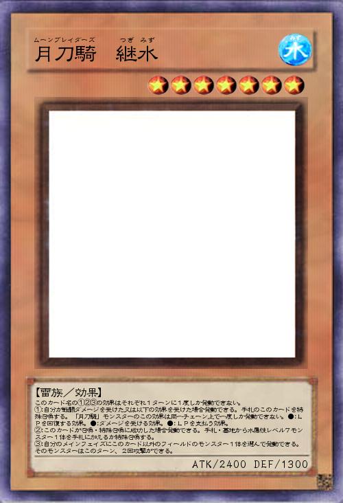 | このカード名の①②③の効果はそれぞれ1ターンに1度しか発動できない。 ①:自分が戦闘ダメージを受けた又は以下の効果を受けた場合発動できる。手札のこのカードを特殊召喚する。「月刀騎」モンスターのこの効果は同一チェーン上で一度しか発動できない。●:LPを回復する効果。●:ダメージを受ける効果。●:LPを支払う効果。 ②:このカードが召喚・特殊召喚に成功した場合発動できる。手札・墓地から水属性レベル7モンスター1体を手札に加えるか特殊召喚する。 ③:自分のメインフェイズにこのカード以外のフィールドのモンスター1体を選んで発動できる。そのモンスターはこのターン、2回攻撃ができる。 | |||